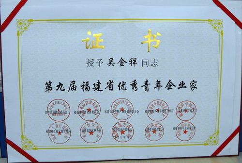 [喜訊] 日前,由共青團(tuán)福建省委員會(huì)、福建省經(jīng)濟(jì)貿(mào)易委員會(huì)、福建省國(guó)有資產(chǎn)監(jiān)督管理委員會(huì)、福建省對(duì)外貿(mào)易經(jīng)濟(jì)合作廳、福建省科學(xué)技術(shù)廳、福建省工商行政管理局、福建省國(guó)家稅務(wù)局、福建省地方稅務(wù)局、福建省環(huán)境保護(hù)局、福建省青年企業(yè)家協(xié)會(huì)共同主辦的“第九屆福建省優(yōu)秀青年企業(yè)家”評(píng)選活動(dòng)揭曉,鷺燕集團(tuán)董事長(zhǎng)兼總裁---吳金祥先生榮獲“福建省優(yōu)秀青年企業(yè)家”榮譽(yù)稱(chēng)號(hào)!