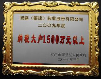 2010年3月23日,廈門湖里區(qū)人民政府召開2009年度納稅先進(jìn)企業(yè)表彰大會,并公布2009年度納稅先進(jìn)企業(yè)名單,鷺燕集團(tuán)核心成員企業(yè)鷺燕(福建)藥業(yè)股份有限公司光榮登榜。自2006年以來鷺燕集團(tuán)已連續(xù)四年獲得納稅大戶(1000萬以上)榮譽(yù)稱號。