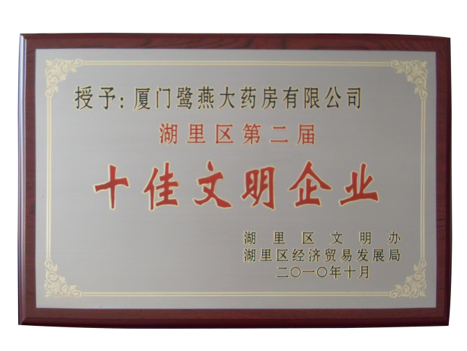 廈門鷺燕大藥房有限公司于2010年10月被廈門市湖里區(qū)文明辦、廈門市湖里區(qū)經濟貿易發(fā)展局評為湖里區(qū)第二屆“十佳文明企業(yè)“榮譽稱號。