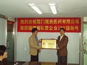 由福建省私營企業(yè)協(xié)會(huì)、福建日?qǐng)?bào)社聯(lián)合開展的2005年度“福建省私營企業(yè)100強(qiáng)”評(píng)定活動(dòng),于近日揭曉最終入圍企業(yè),廈門鷺燕醫(yī)藥有限公司榜上有名。今天,市工商局的領(lǐng)導(dǎo)來我司進(jìn)行了授牌儀式。儀式上,吳金祥總裁向領(lǐng)導(dǎo)們介紹了鷺燕的成長歷程,并對(duì)將來的經(jīng)營進(jìn)行了展望。領(lǐng)導(dǎo)們?cè)诼犎×藚强偛玫膮R報(bào)后,肯定了鷺燕的發(fā)展模式,同時(shí),也對(duì)鷺燕的可持續(xù)發(fā)展提出了許多有益的建議。